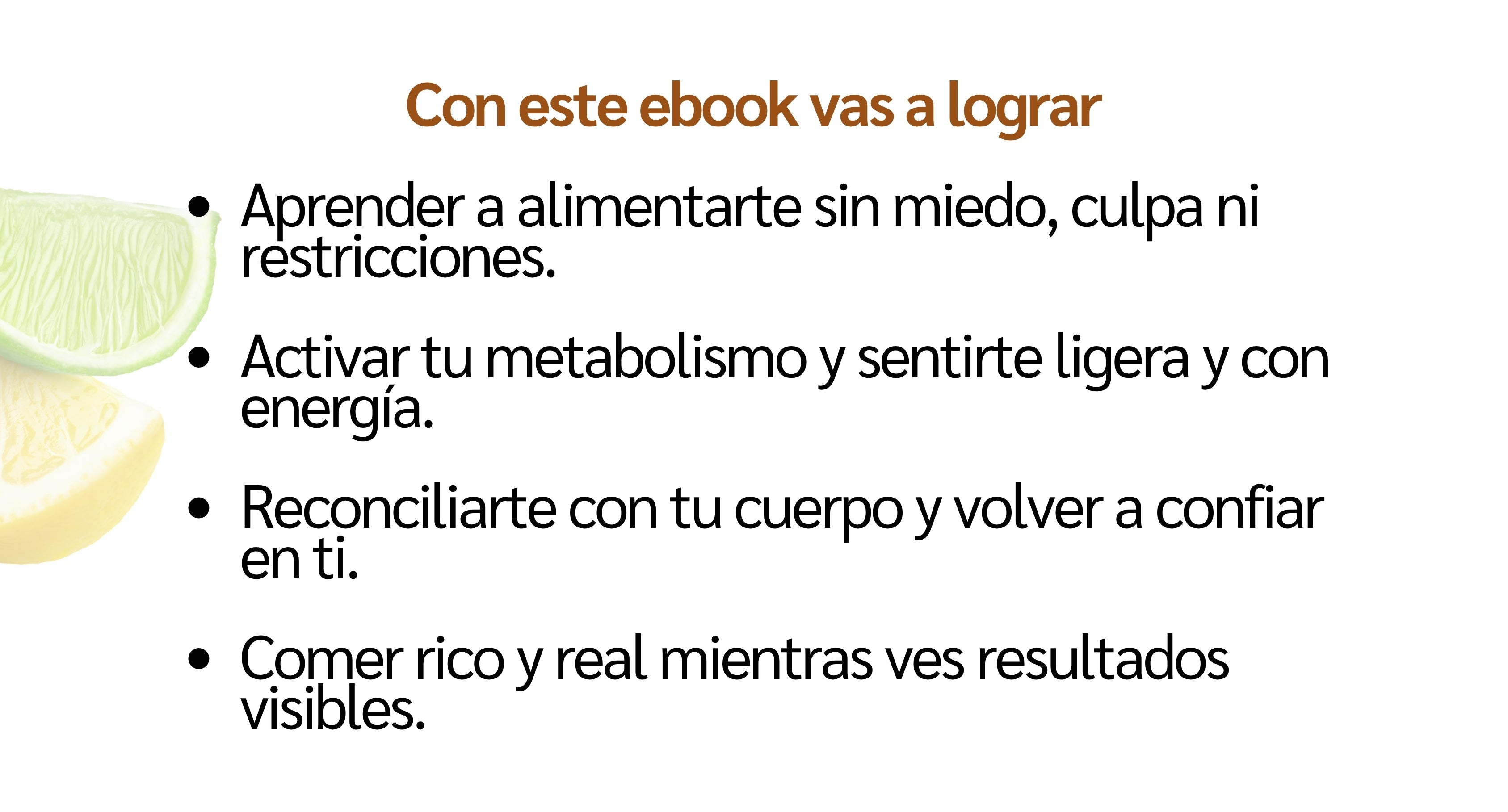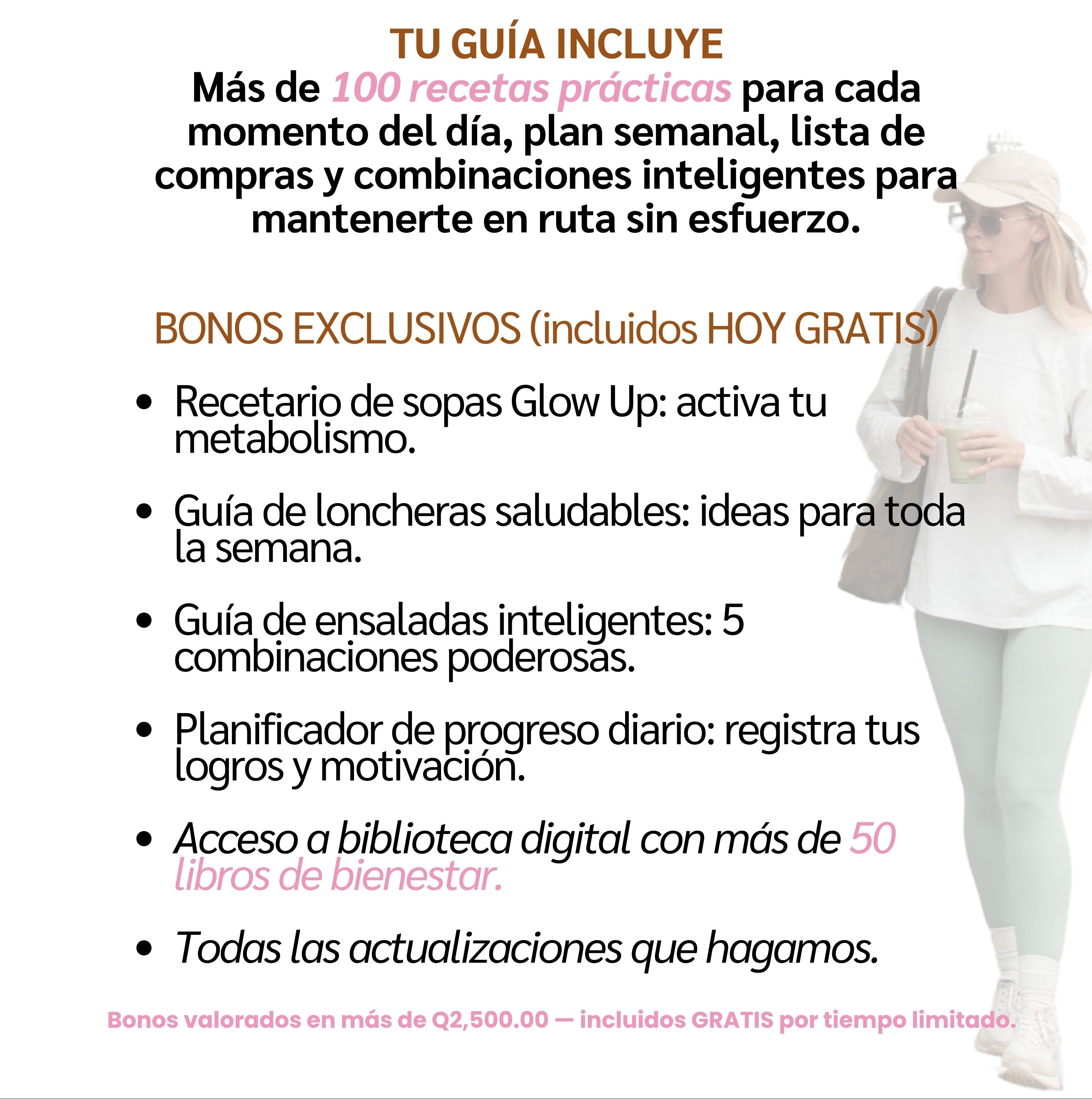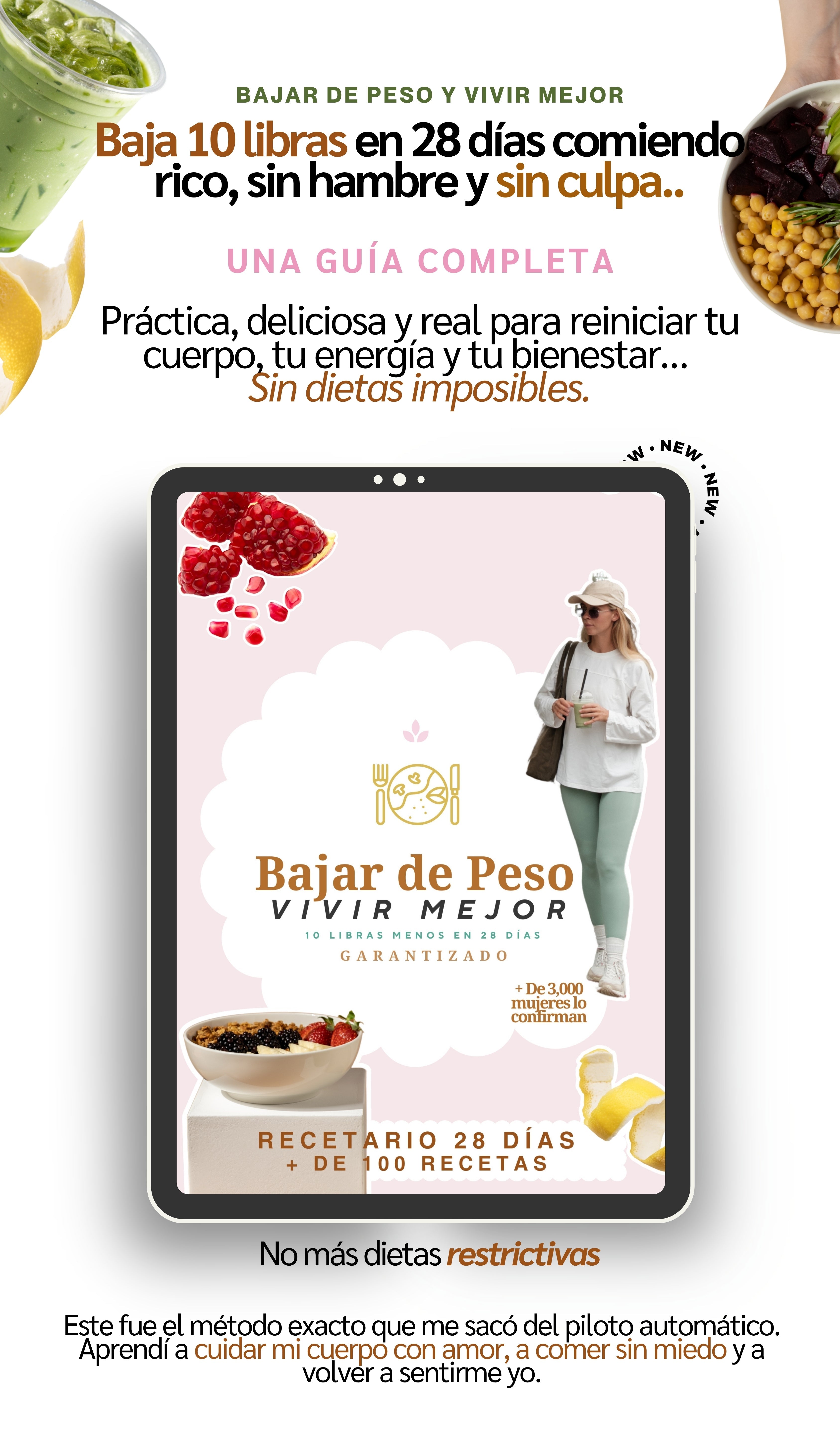 Incluye desayunos, almuerzos, cenas y snacks con ingredientes reales, nutritivos y fáciles de conseguir, todo pensado para que tu cuerpo se sienta mejor en cada comida.